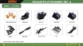 (1) 8 in Bucket, (1) 24 in Bucket, (1) 32 in Bucket, (1) Auger w/ 8 in & 12 in Bits, (1) Quick Coupler, (1) Rake, (1) Ripper, (1) Grapple, (1) Set of Bucket Teeth w/ Side Cutter ; Product images displayed are stock photos. Item is new/unused.