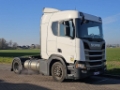 Number of axles: 2, Configuration: 4x2, Own weight: 8095 kg, Gross vehicle weight: 20500 kg, Total fuel capacity: 837 litre, 2nd fueltank, Fifth wheel height: 116 cm, fifth-wheel: Fixed, Suspension type: air suspension, Cabin type: Sleeping cabin, Cruise control, Tacho, Digital tachograph, Airconditioning, Parking heater, Electric windows, Electric mirrors, Radio/cassette, Color: white, Heated mirrors, Lighting type: Halogen lamps, Laneassist, Climatecontrol, Seat heating, Bluetooth, Engine capacity: 301 Kw (404 Hp), Fuel type: Natural gas, Euro: 6, Gearbox kind: Opti-cruise, Gearbox make: Scania, Number of Gears: 12, Add. break system, Retarder make: Scania, Power steering, ABS, ASR, Starter battery, Central locking, Seats configuration: 1+1, Seat cover: cloth, Chair adjustment: Manually, LNG