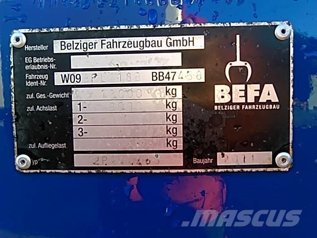 Przyczepa ciężarowa do transportu drewna stosowego i kłód leśnych Befa ,2011 rok,zabudowa platforma+dodatkowe gniazda,masa całkowita 18000 kg,masa własna 4650 kg,dopuszczalna ładowność 13350 kg,długość zabudowy 650 m,zawieszenie poduszka,waga elektroniczna,ogumienie 275/70 R 22,5,bliżniak,sprowadzony z Niemiec,Stan idealny